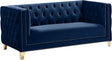 Upholstered in soft navy velvet, this Michelle love seat is sumptuously glamorous. Designed for upscale living, this chair features rich gold nail head trim and gold iron legs that keep it grounded in contemporary beauty. Tufted material covers every inch of this unit, and button tufting ensures that the unit stays plump and comfortable and holds up well to continual use. Pair it with other items in the collection for a cohesive look.