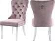 Dine in luxurious style with the Miley pink velvet dining chair. Featuring a curved high back, plush cushioned seat and deep tufted pink velvet upholstery studded with chrome nailheads, this dining chair is sure to take your dining experience to a whole new level. Clear Acrylic legs provide sturdy support and complement the stunning pink upholstery for a sleek, contemporary design.