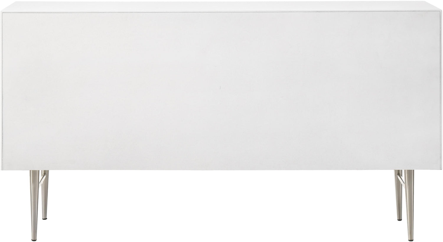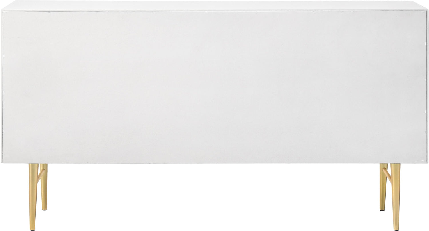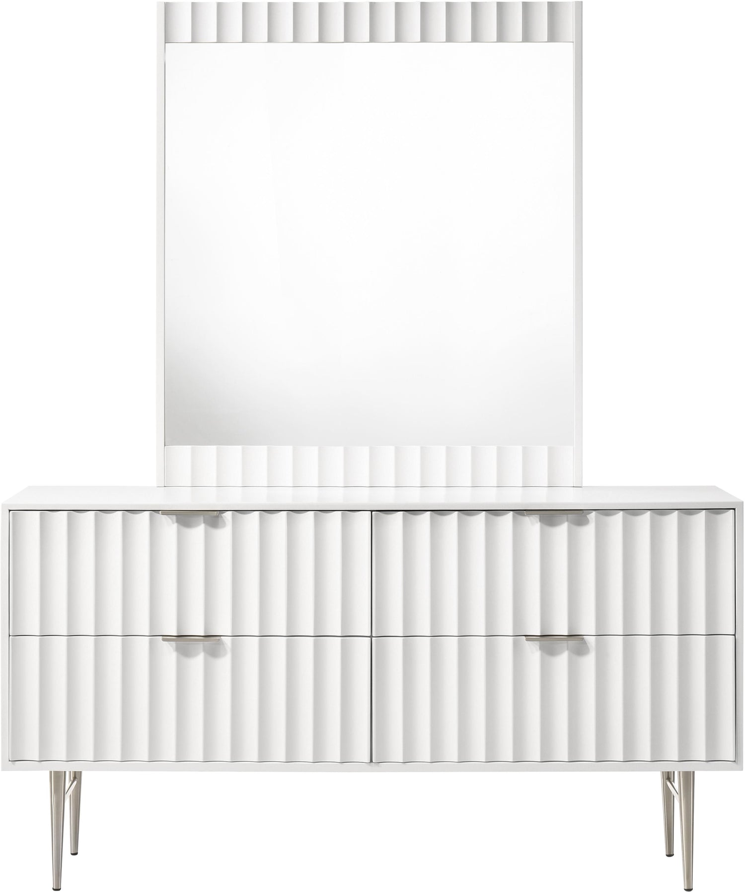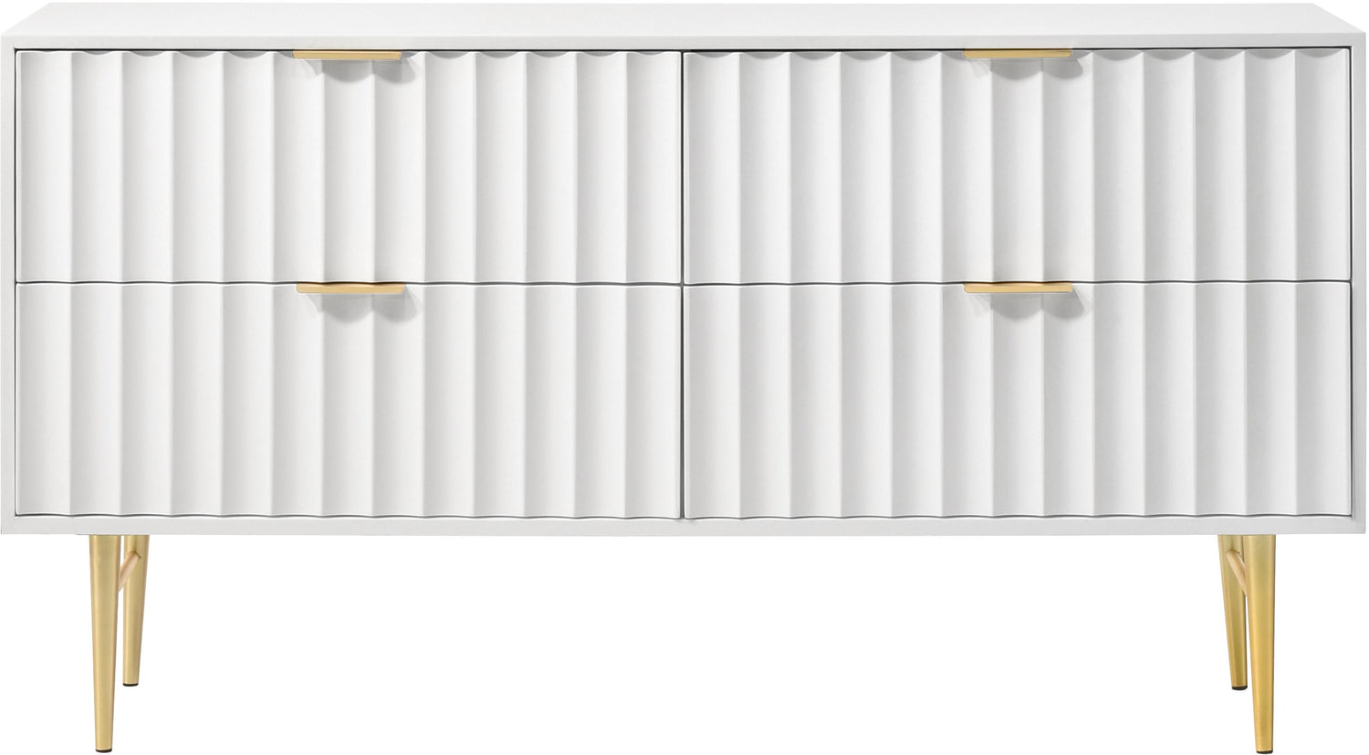 Embody industrialist style with this Modernist dresser in a white medium gloss finish. Utilitarian but sculptural in design, this piece features a ridged, textured look that is chic but sleek. It rests on brushed gold steel legs and has gold brushed handles for a bit of regality. Combine this piece with other items in the Modernist lineup for a cohesive finish to your room makeover.