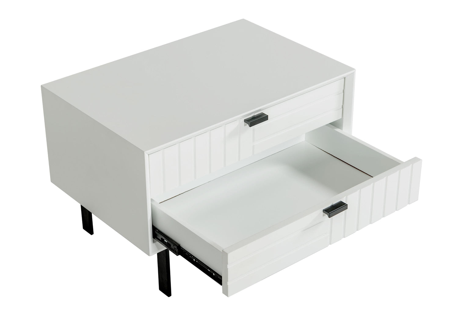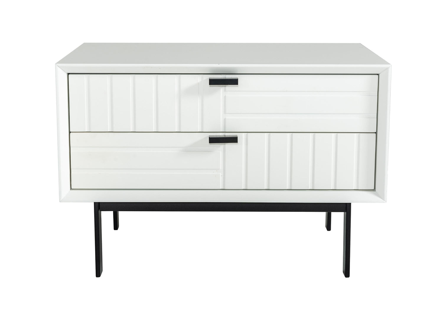 Nice and sassy is the Nova Domus Valencia - Contemporary White Nightstand. Featuring a remarkable white matte finish, it comes with 2 sliding drawers to keep your items near your bed. On the drawer fronts are vertical and horizontal ridges placed on interchangeably. Sleek black metal legs and handles offer a striking disparity.