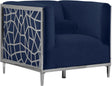 Catch the eyes of all who step foot in your home with this bold Opal navy velvet chair. Its chrome stainless steel patterned design creates a contemporary flair against its plush, navy velvet upholstery, creating a home accent piece that is both comfy and stylish. Its roomy design offers ample room to kick back and relax after a long day, while its stocky shape adds a daring touch to your decor.