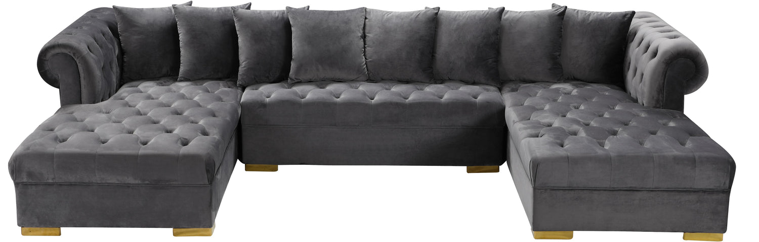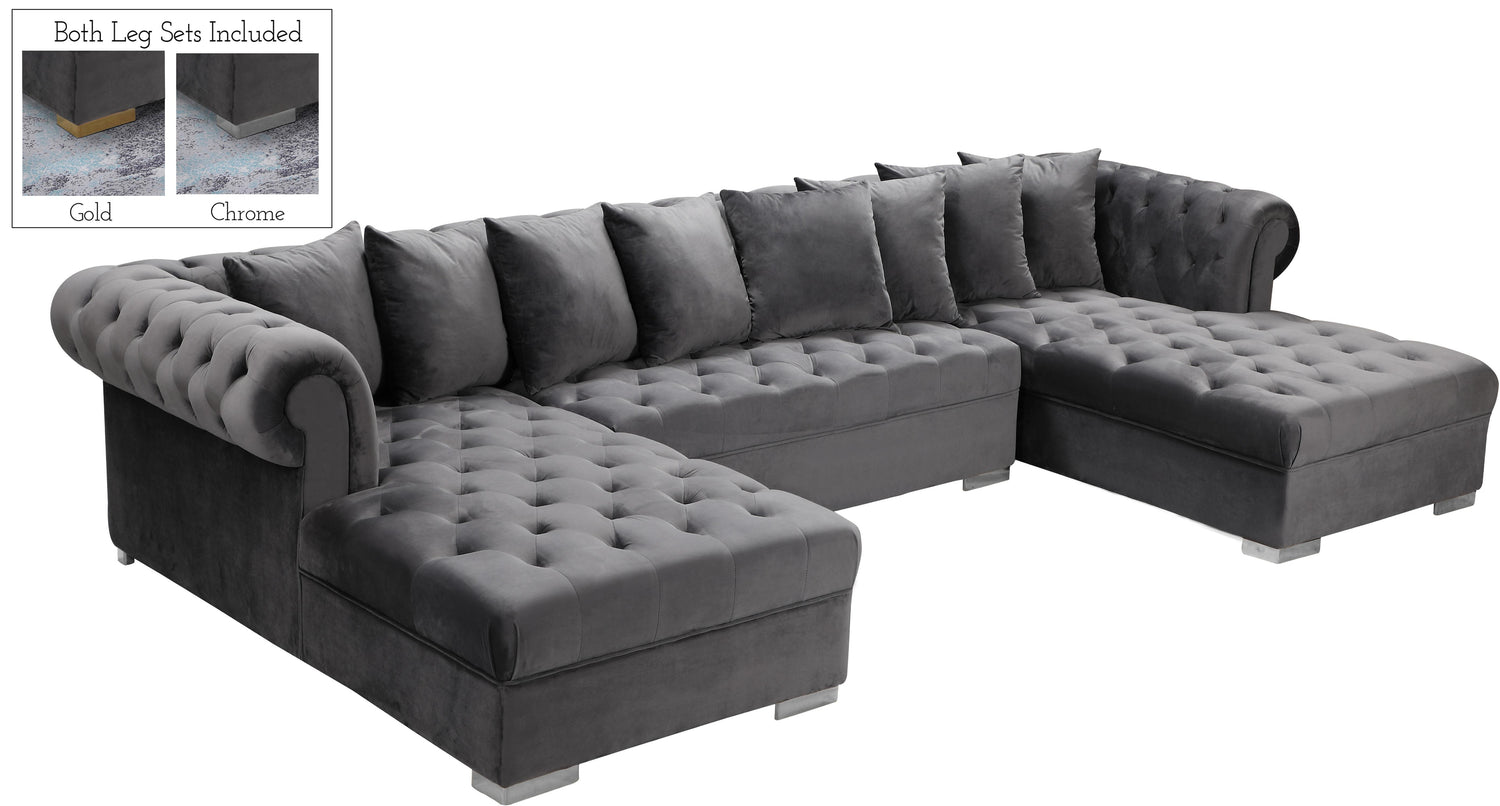 Get ready to relax after a long day with this Presley Grey Velvet 3pc. Sectional from Meridian Furniture. Featuring rich grey velvet upholstery with deep tufting and comfy pillows, this double chaise sectional provides a luxurious, cozy space to kick back and watch TV, take a nap, or curl up with a nice book. Complete sets of gold and chrome legs complement your contemporary home decor while providing solid support for the sectional's frame.