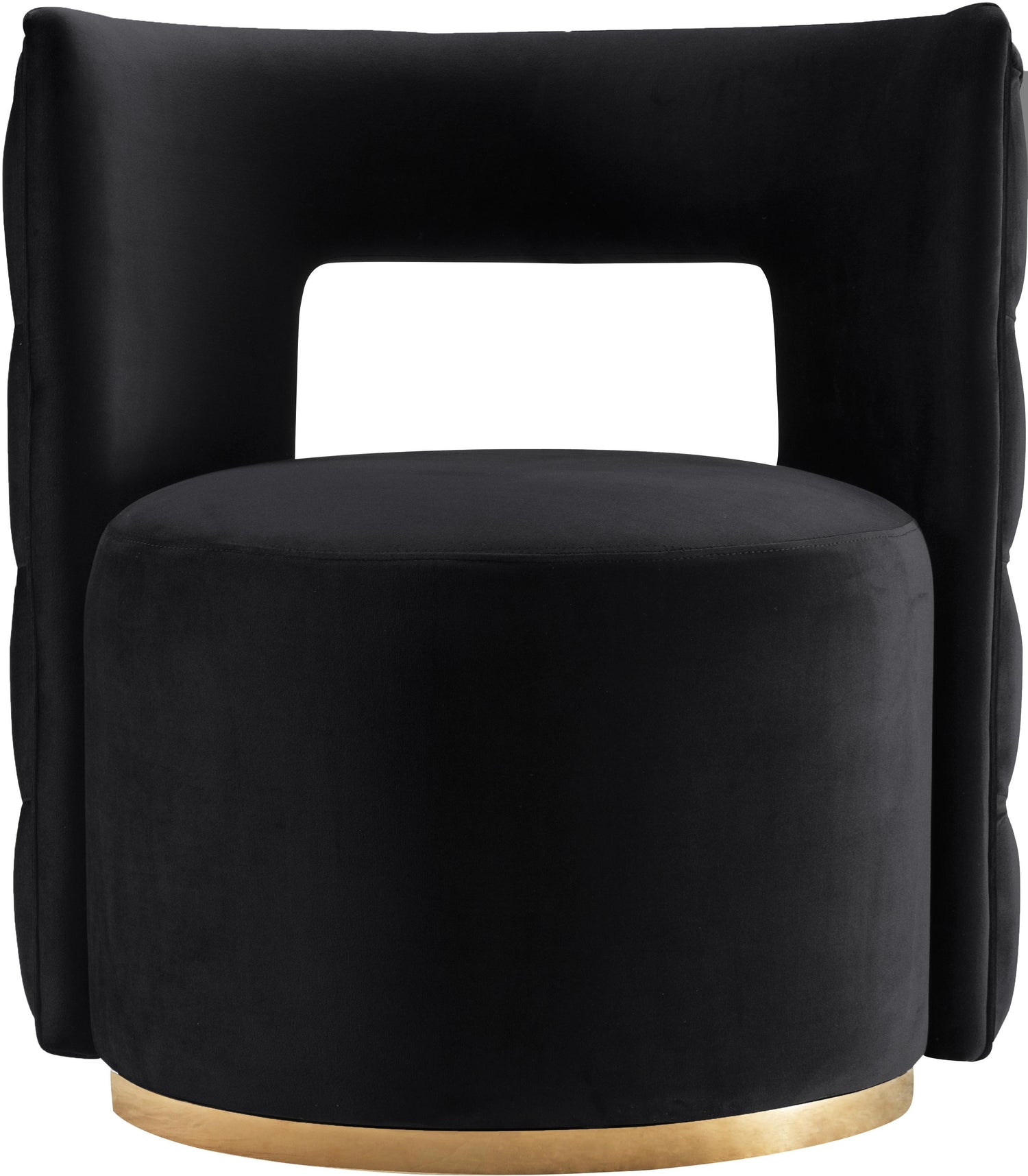 Complement your contemporary decor with this Theo Black Velvet Accent Chair from Meridian Furniture. Featuring a contemporary design with button tufting on the back, this chair is sure to immediately draw the eyes of all who enter your home. Rich black velvet upholstery makes this chair luxurious to sit in, and the opening in its back ensures ample air flow while you curl up with your favorite book or in front of the TV. Its gold swivel base accentuates its velvety dark color, while allowing you to turn whichever way you choose as you recline.