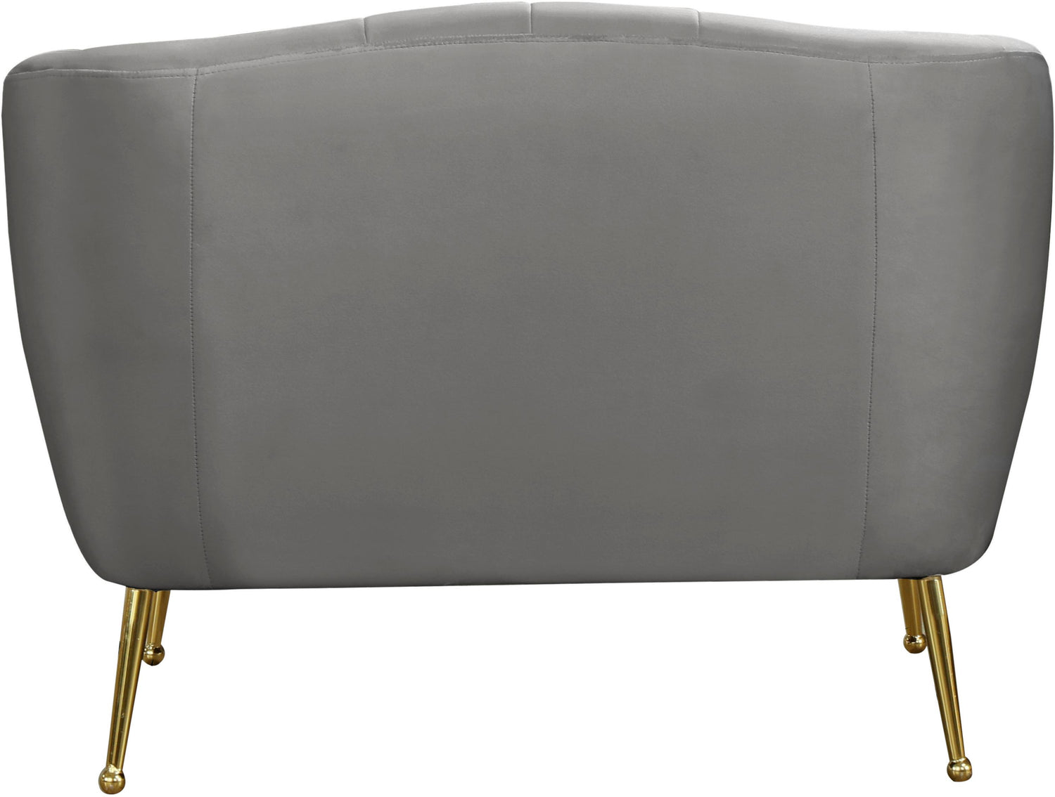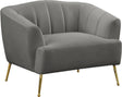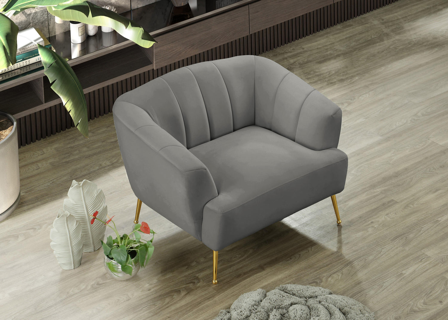 Dress up your living room space with this Tori Velvet Chair. This plush chair features sleek grey velvet upholstery that covers every square inch, adding a sumptuous and svelte look to your room. The gold legs with a ball design on the foot adds to the elegant look of this pretty chair, and deep channel tufting adds loft to the back and arms for a lavish feel when you sit down to relax and unwind at day���s end.