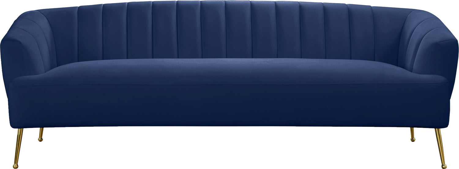 Dress up your living room space with this Tori Velvet Sofa. This plush sofa features sleek navy velvet upholstery that covers every square inch, adding a sumptuous and svelte look to your room. The gold legs with a ball design on the foot adds to the elegant look of this pretty chair, and deep channel tufting adds loft to the back and arms for a lavish feel when you sit down to relax and unwind at day���s end.