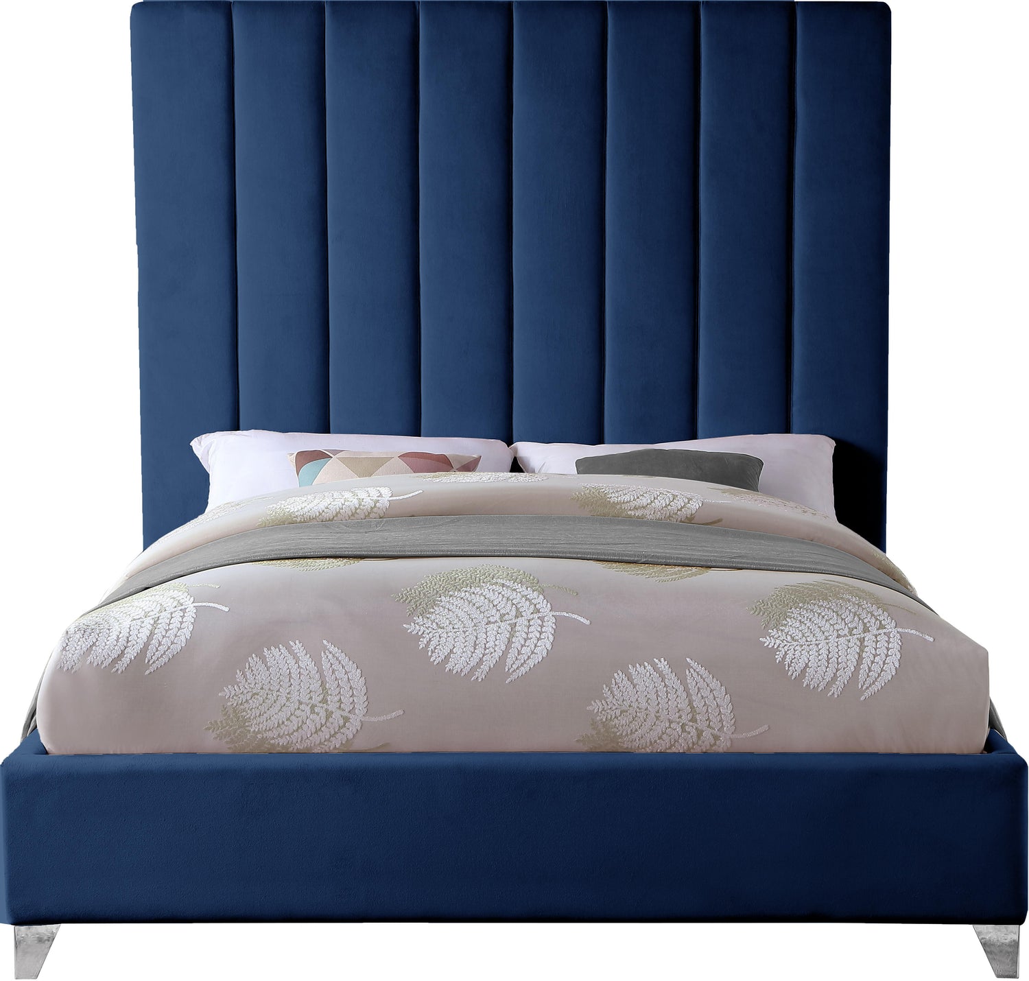 Take the look of your bedroom to new decorative heights with this ultra-modern Via upholstered queen bed. Rich navy velvet upholstery gives this bed a true upscale feel and epitomizes fine living while channel tufting along the headboard keeps the padded material inside plump and aloft���so it cradles your body while you sit up in bed to watch TV or read. Metal legs bring this platform bed up off the floor, allowing clearance below for cleaning and adding to its svelte contemporary profile.