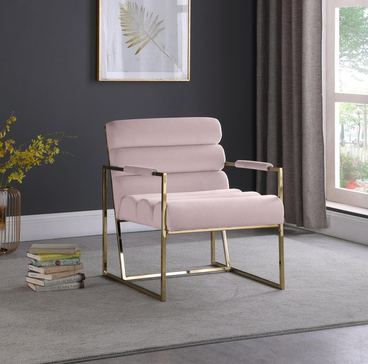 This Wayne velvet accent chair is a fitting addition to any contemporary interior space. Lovely soft pink velvet feels sleek and chic to the touch, ensuring thatyou'rere seated in total comfort. Deep channel tufting along the back and seat of the chair and its padded arms add to its comfort potential. The chair���s gold iron frame adds to its contemporary design and lends it the sturdiness needed for years of beautiful use.